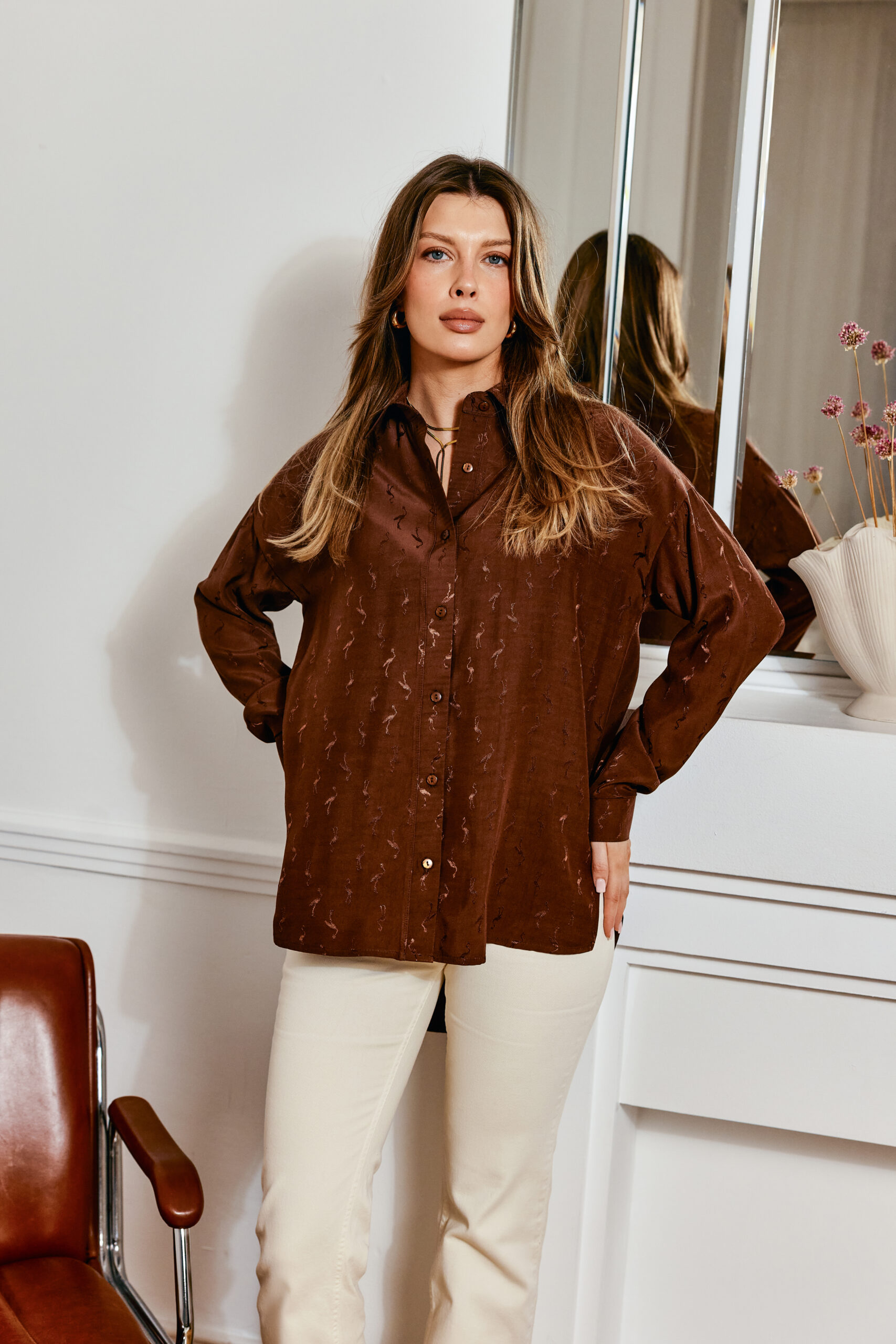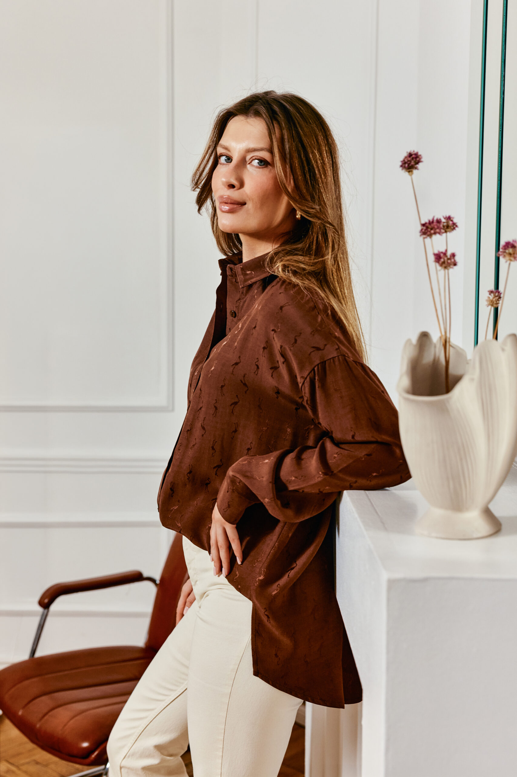 Brązowa koszula damska z satyny z nadrukiem flamingów – lekki, błyszczący materiał dodaje subtelnej elegancji, a wzór w flamingi wprowadza zabawny akcent.
