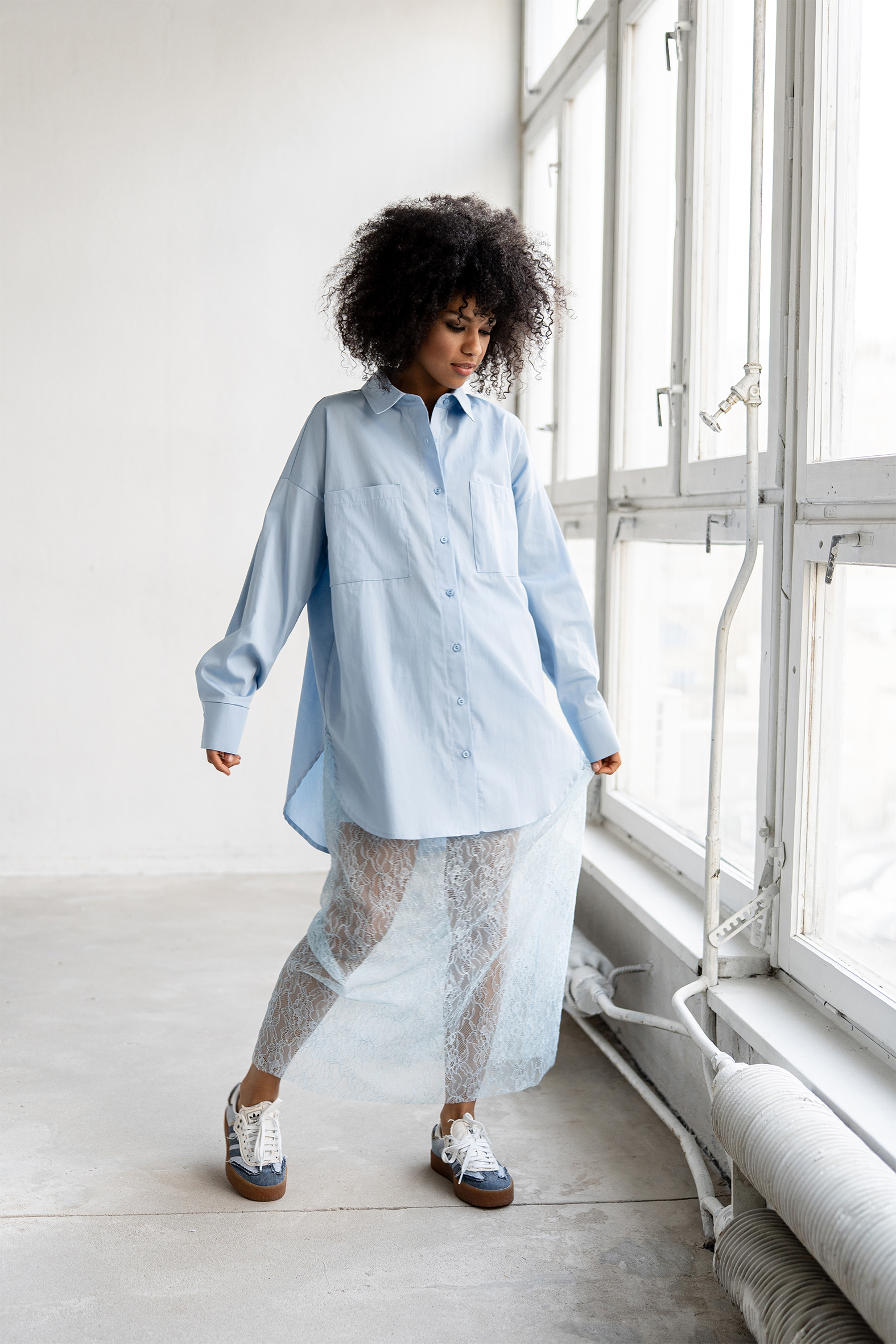 Niebieska koronkowa spódnica łączy wygodę z wyrazistym stylem.