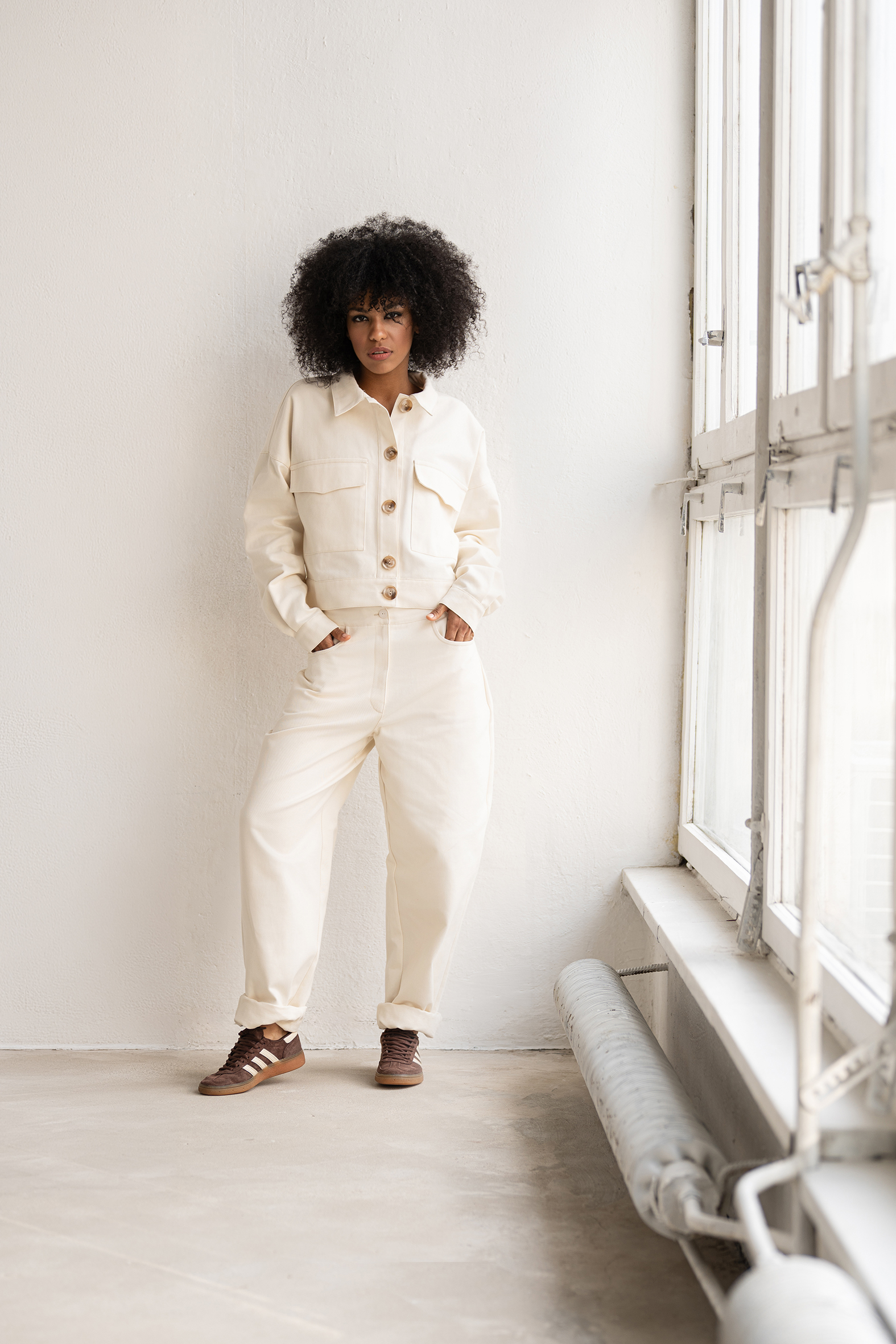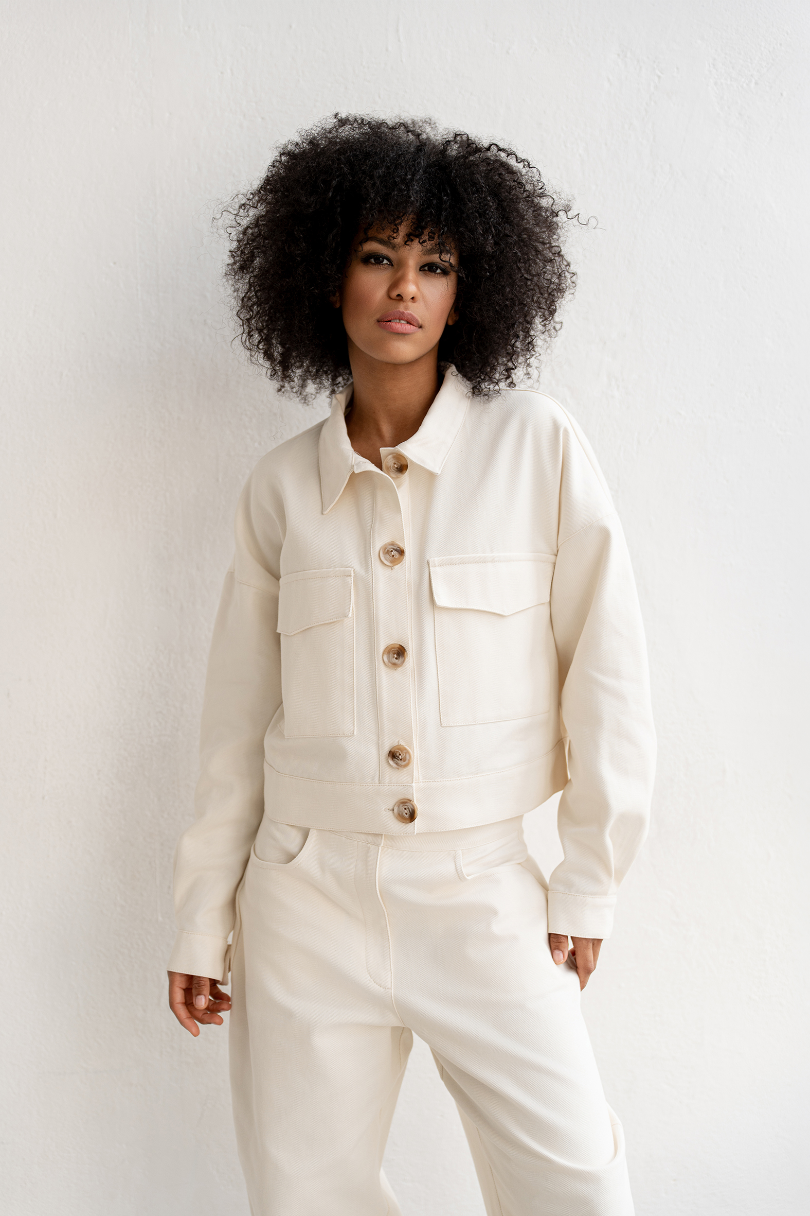 Praktyczne kieszenie dodają funkcjonalności, a jasny, neutralny odcień sprawia, że łatwo je zestawić z kurtką lub innymi elementami garderoby.