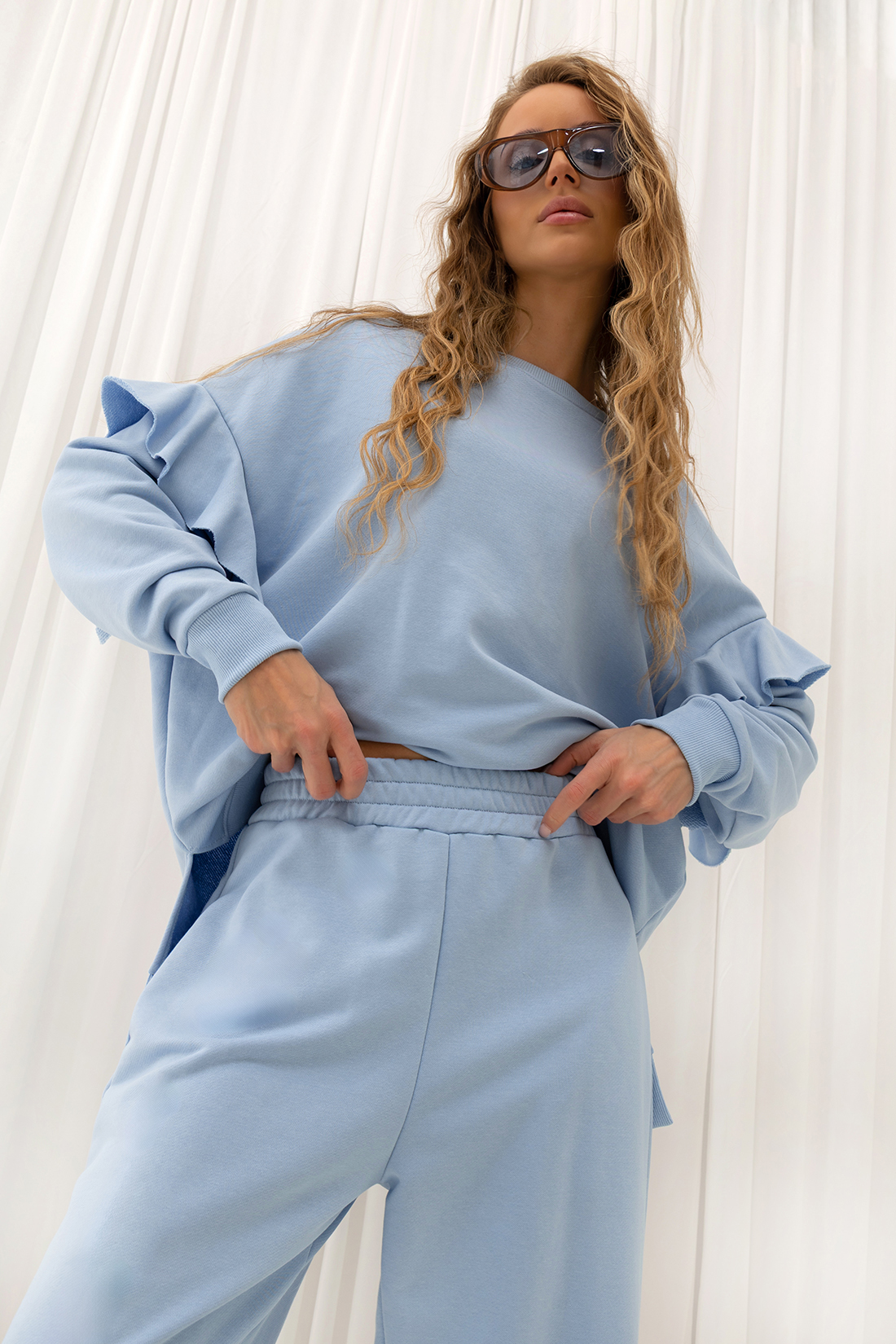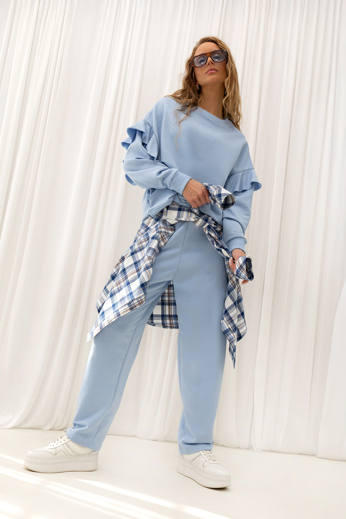 Niebieskie spodnie z kieszeniami w połączeniu z bluzą Riva tworzą zestaw pełen świeżości i swobody ruchu.