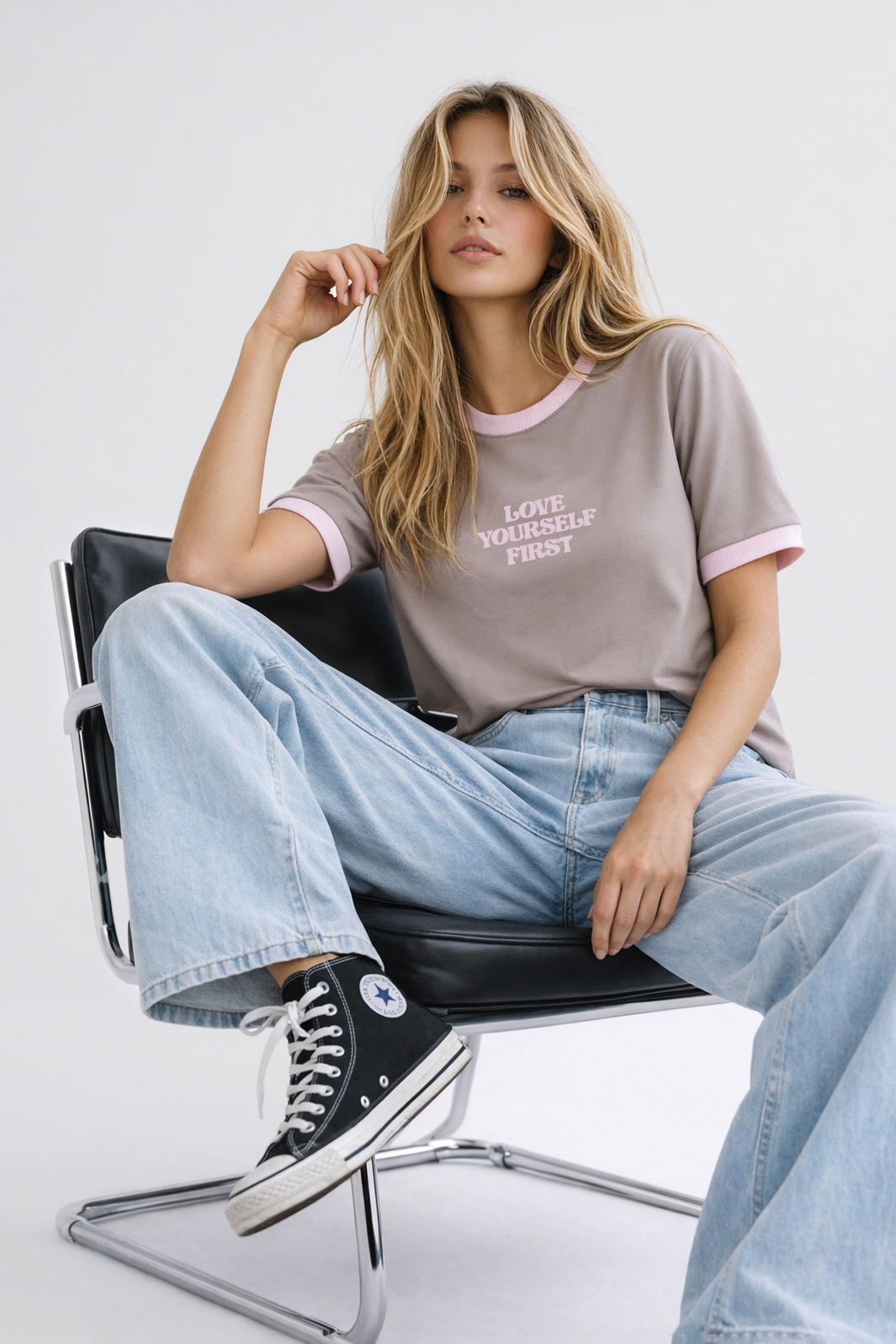 Beżowy t‑shirt damski z napisem „Love Yourself” i różową lamówką to połączenie subtelności z modnym detalem.