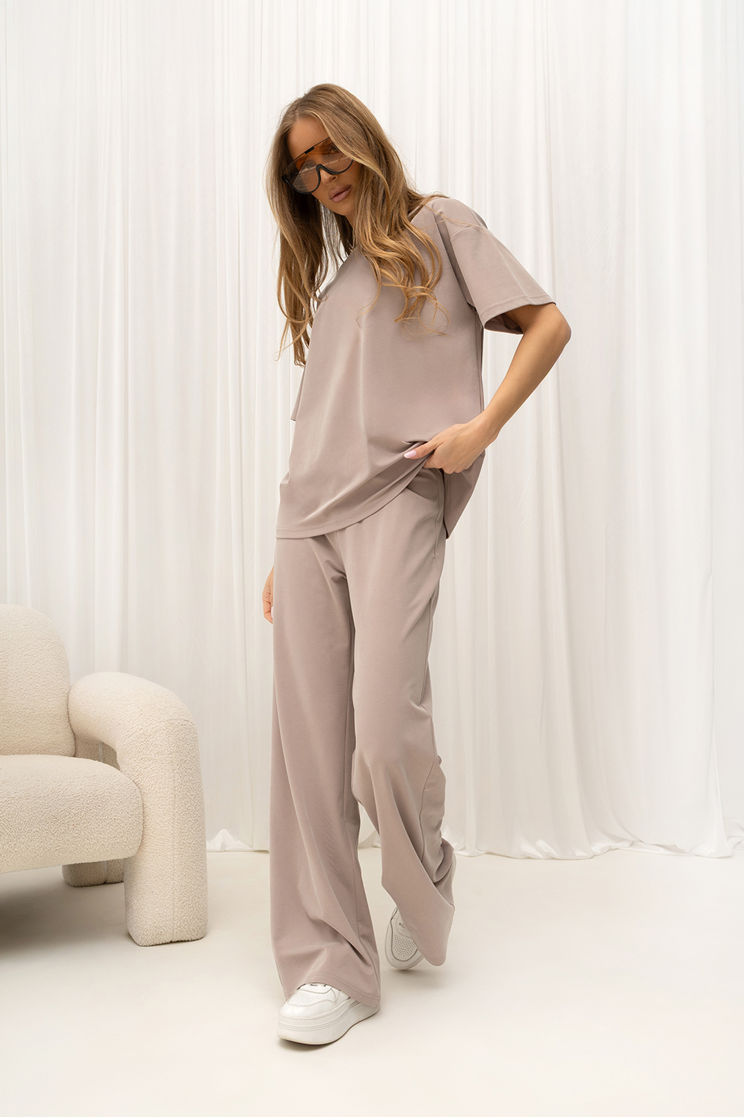 Można go zestawić z pasującymi spodniami, tworząc kompletny look — model pojawia się również w