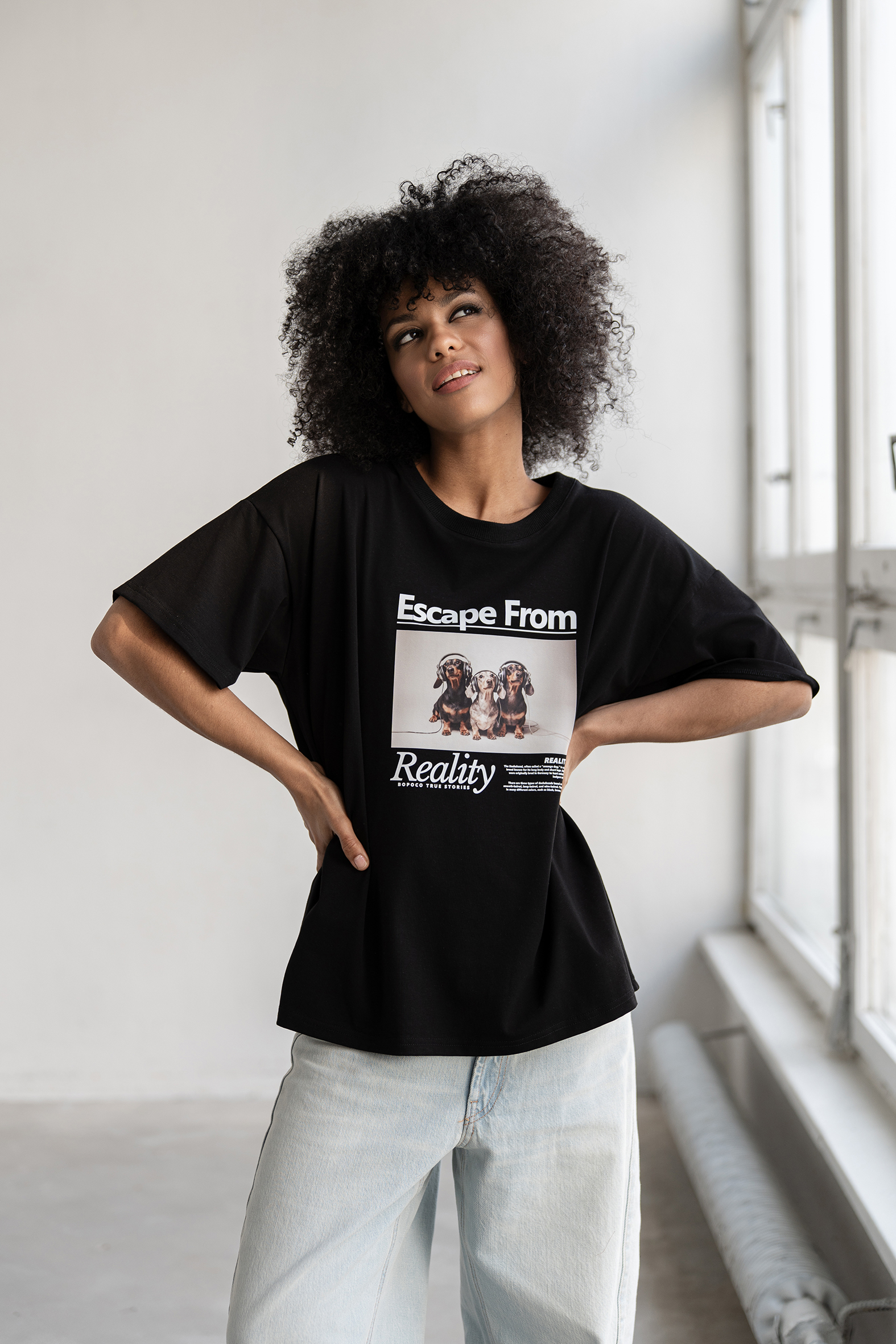 Czarny t‑shirt Escape z nadrukiem jamników to wygodny i uniwersalny element codziennych stylizacji.