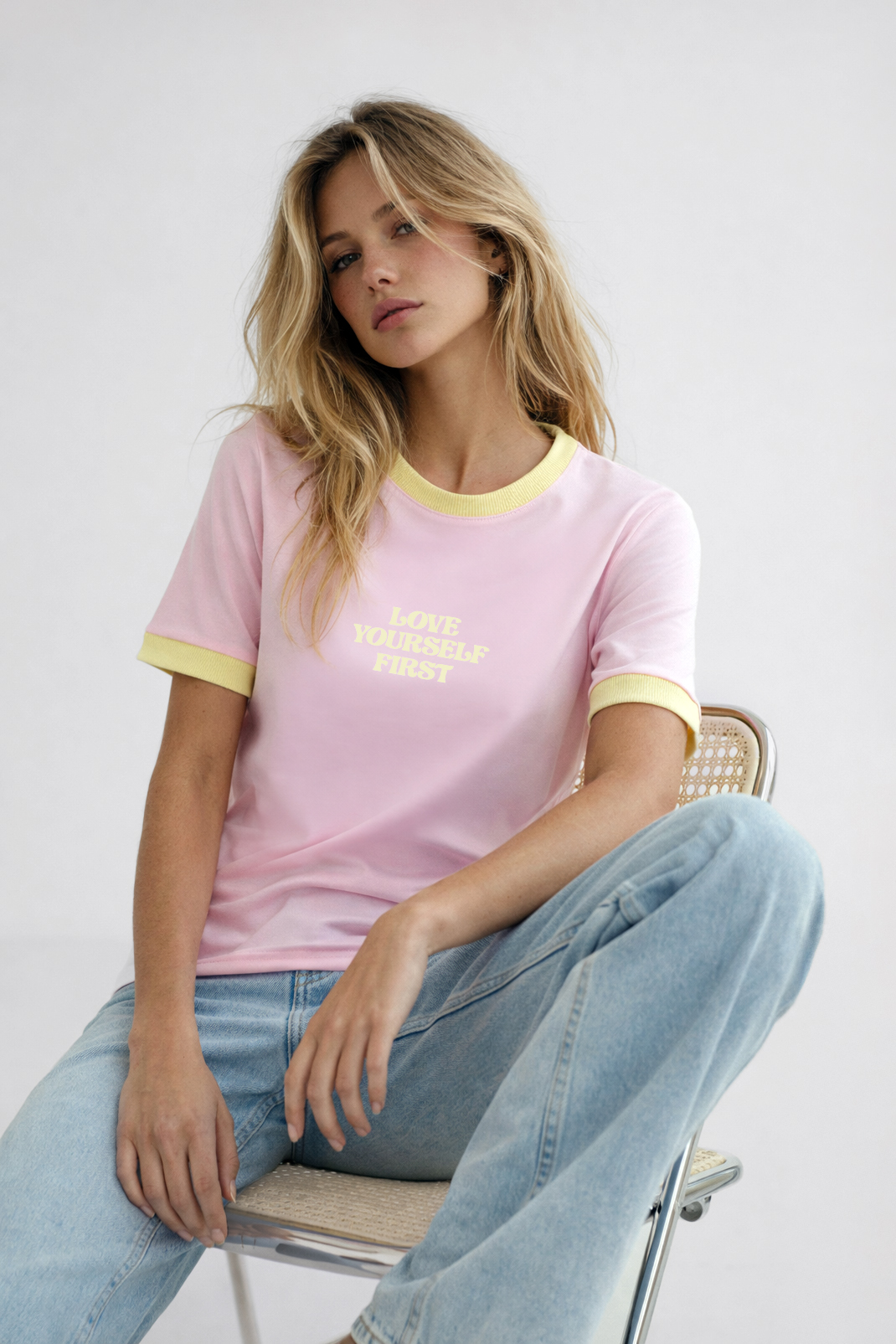 Różowy damski t‑shirt z napisem „Love Yourself” i żółtą lamówką to lekki i energetyczny element garderoby.