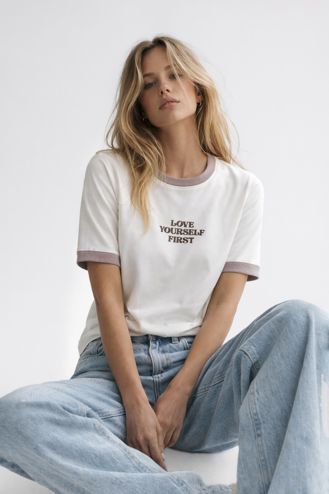 Śmietankowy damski t‑shirt z napisem „Love Yourself” i beżową lamówką łączy wygodę z modnym stylem.