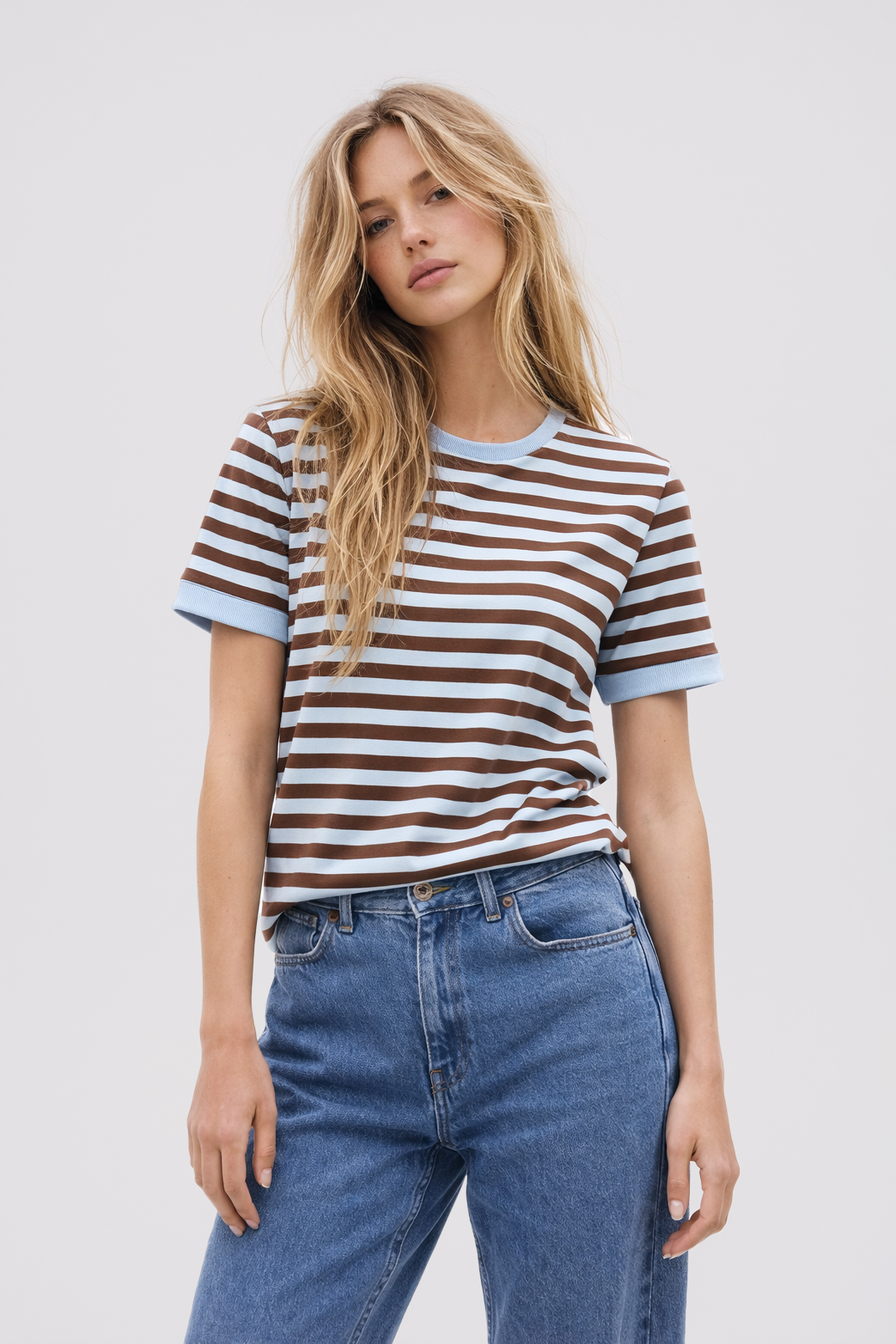 Klasyczny T-shirt w paski w odcieniach niebieskiego i brązowego, łączący komfort noszenia z modnym, energetycznym stylem.