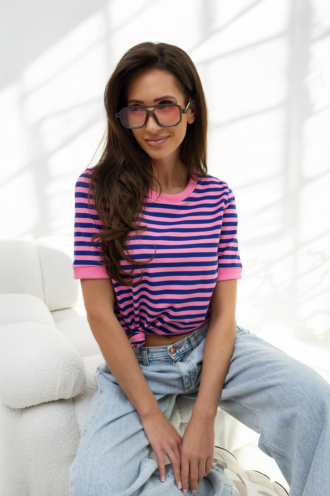 T-SHIRT W PASKI RÓŻOWO-GRANATOWE