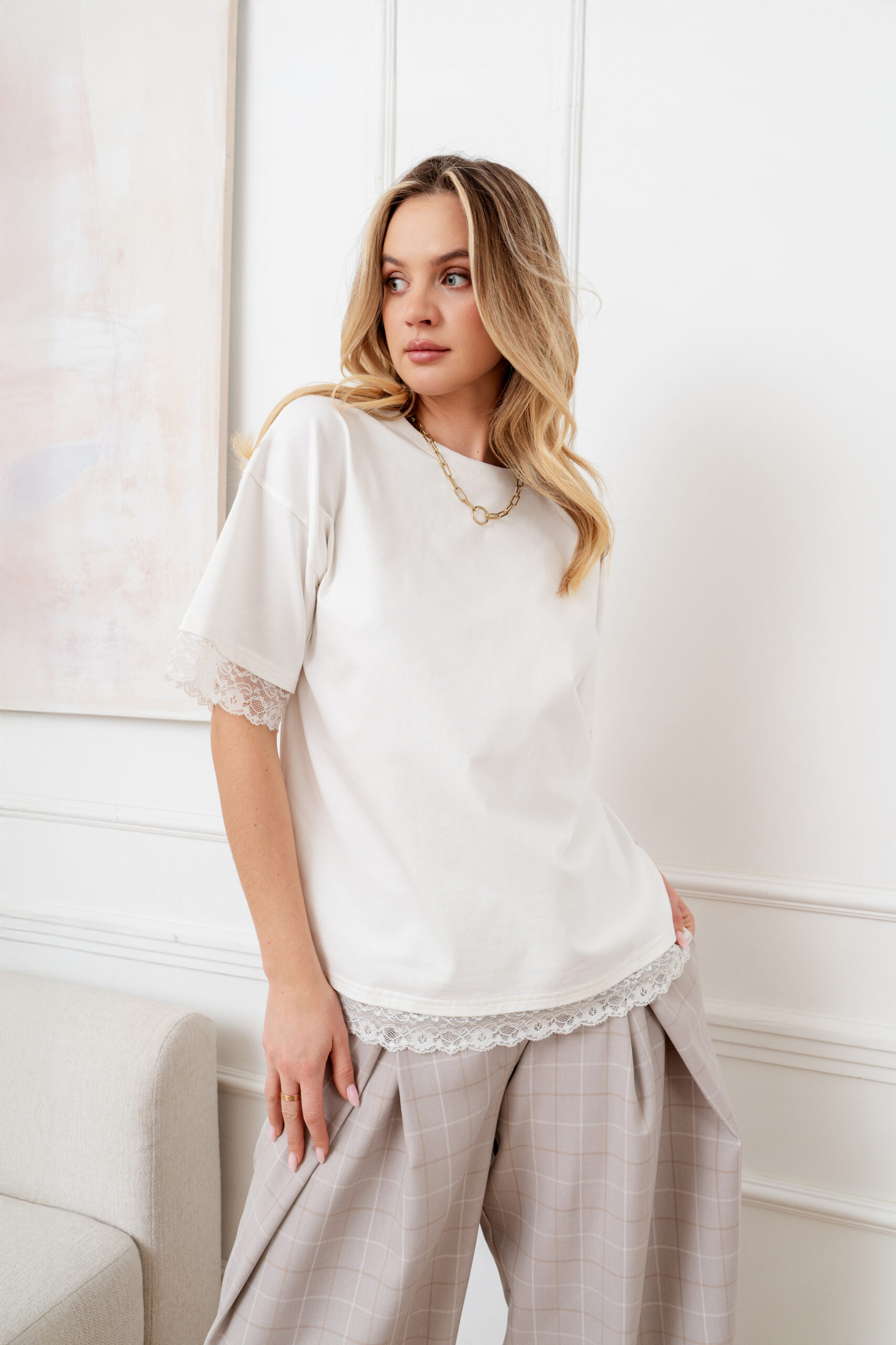 Subtelna koronka na dole i rękawach dodaje delikatnego, romantycznego akcentu, a swobodny fason sprawia, że koszulka pasuje do codziennych, komfortowych stylizacji.